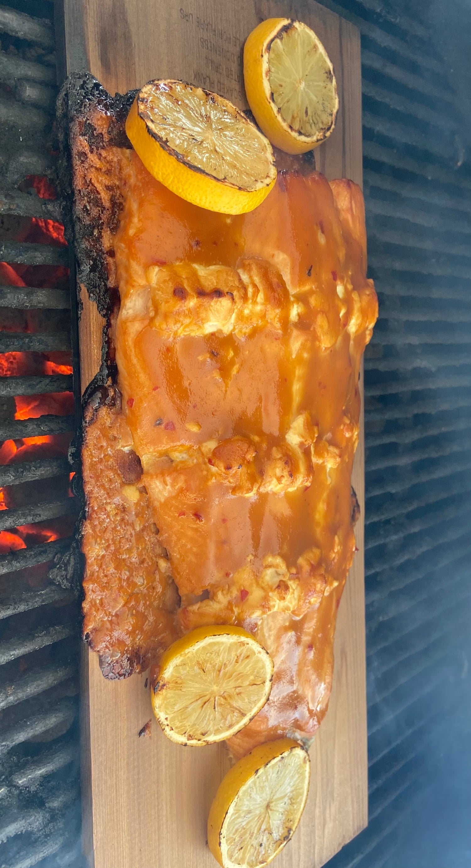 Préchauffez le BBQ à 350F. Faire tremper la planche de cèdre dans l'eau pour 1h (avant l'utilisation). Faire des incisons sur la largeure du filet de saumon (à chaque 3-4 cm). Remplir les fentes de fromage de chèvre. Badigeonner de sauce Ruée ver l'Or. Cuire sur la planche en cuisson directe jusqu'à température interne désirée! Savourez!